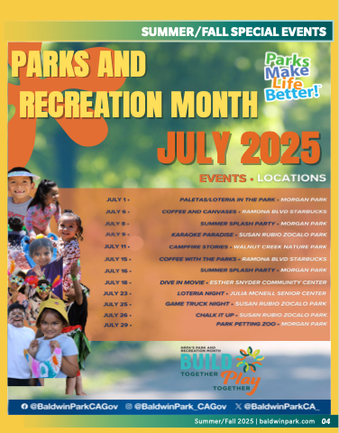 SUMMER/FALL SPECIAL EVENTS PARKS AND PARKS AND RECREATION MONTH RECREATION MONTH JULY 2025 JULY 2025 EVENTS • EVENTS • Summer/Fall 2025 | baldwinpark.com 04