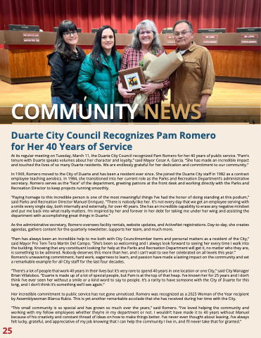 At its regular meeting on Tuesday, March 11, the Duarte City Council recognized Pam Romero for her 40 years of public service. “Pam’s