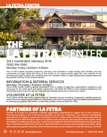 Monday-Thursday | 8:30am-4:00pm The La Fetra Center works to gather information from a variety of agencies, organizations, programs, and resources for the older adult and senior community. Call (626) 914-0560 if you're seeking assistance and