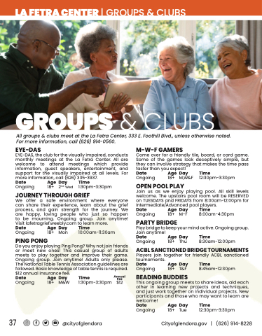 All groups & clubs meet at the La Fetra Center, 333 E. Foothill Blvd., unless otherwise noted. For more information, call (626) 914-0560.