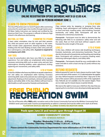 The City of Placentia offers FREE public recreation swim at the Gomez Community Pool and at the Whitten Community Pool.