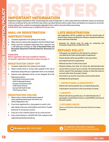 Registration begins September 8, 2025. Classes begin the week of September 15, 2025 unless otherwise indicated. Classes not meeting a