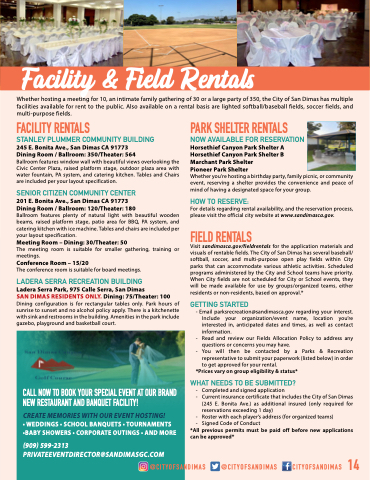 Whether hosting a meeting for 10, an intimate family gathering of 30 or a large party of 350, the City of San Dimas has multiple