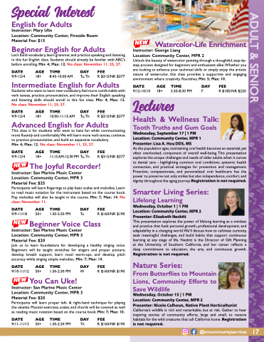 9/9-11/18 50+ 1:30-2:30 PM Tu R $160/NR $190