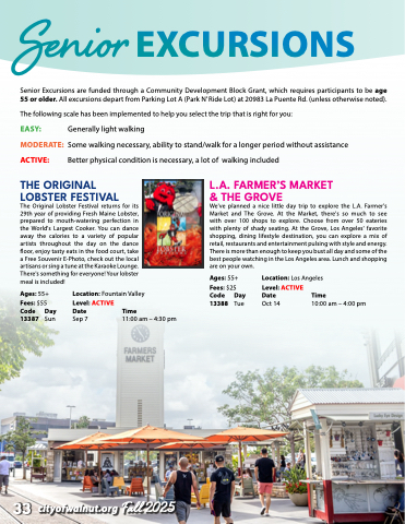 55 or older. All excursions depart from Parking Lot A (Park N’ Ride Lot) at 20983 La Puente Rd. (unless otherwise noted).