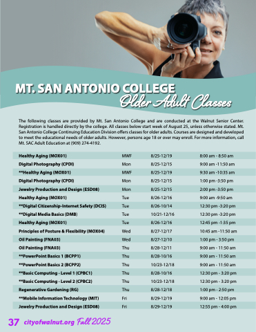 The following classes are provided by Mt. San Antonio College and are conducted at the Walnut Senior Center.