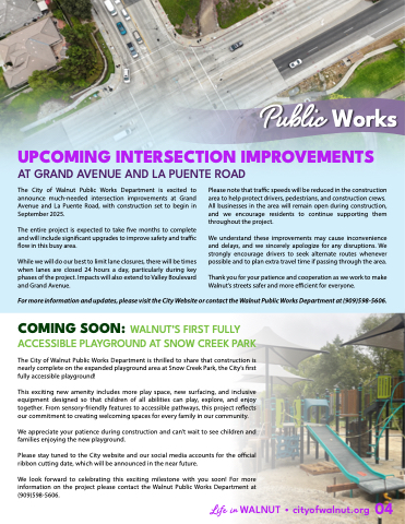 For more information and updates, please visit the City Website or contact the Walnut Public Works Department at (909)598-5606.