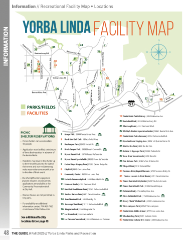 Information // Recreational Facility Map • Locations INFORMATION See additional facility locations list on page 49. 48 THE GUIDE // Fall 2025 // Yorba Linda Parks and Recreation
